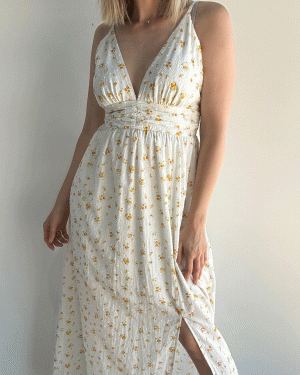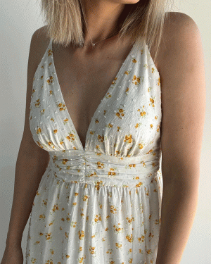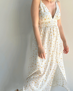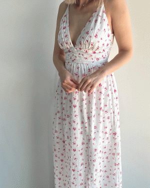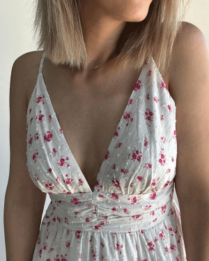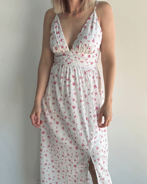 Vestido estampado con flores y plumetti, escote en forma de pico y tirante regulable.