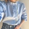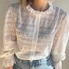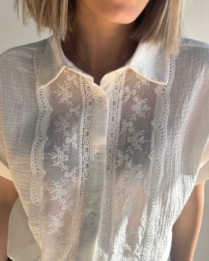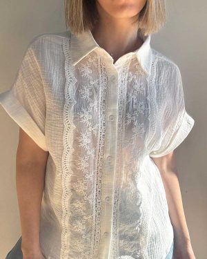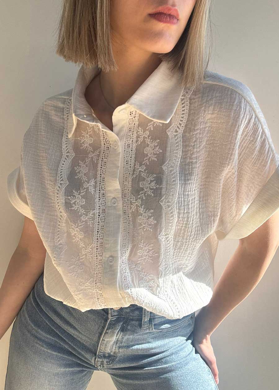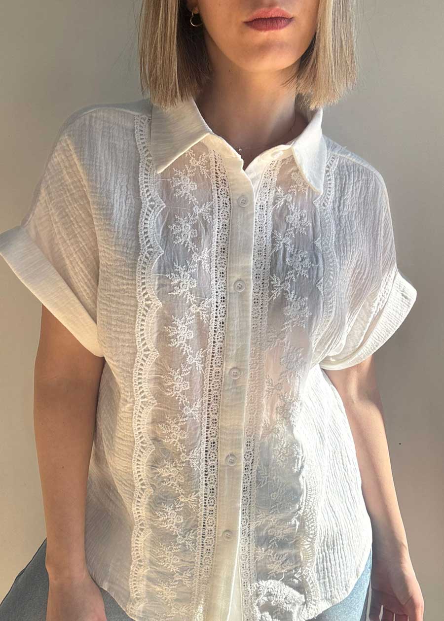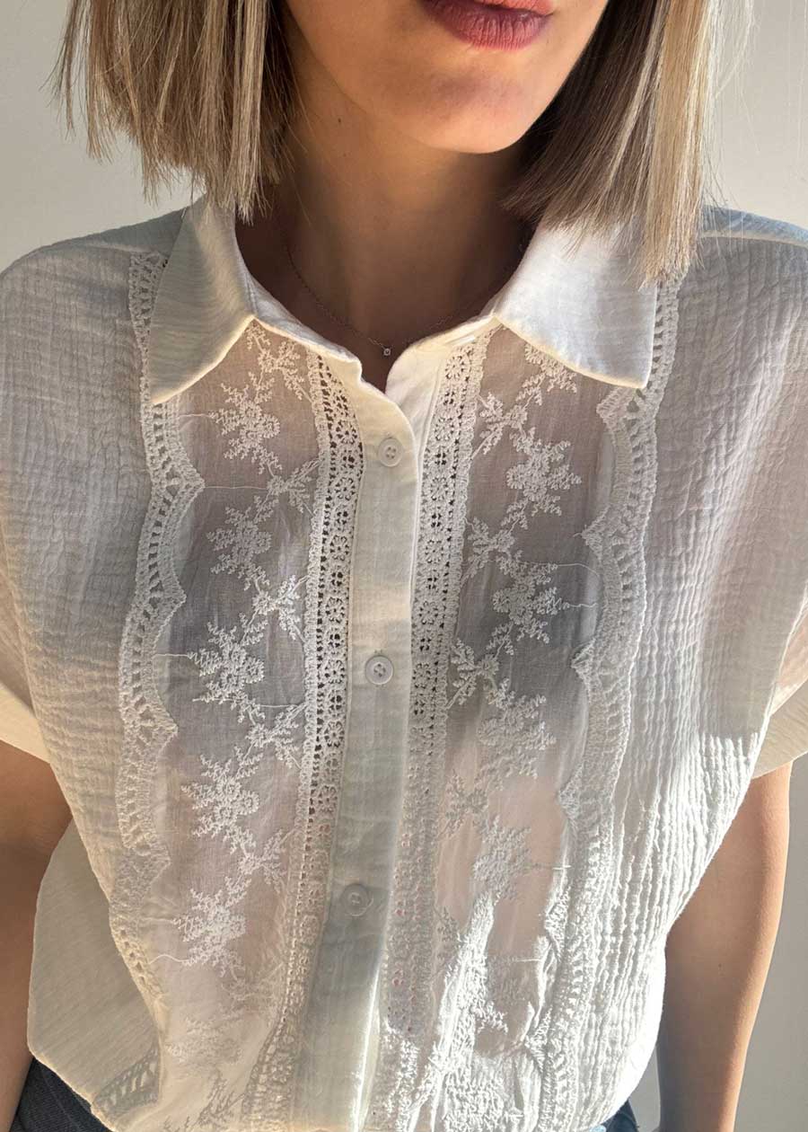 Camisa de manga corta con cuello camisero y detalles calados en la parte delantera.