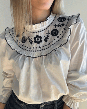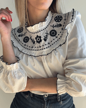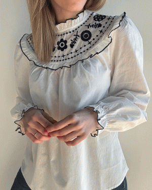 Blusa lisa con bordado en la pechera y volantito con filos tanto del cuello como de los puños en color azul marino.