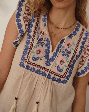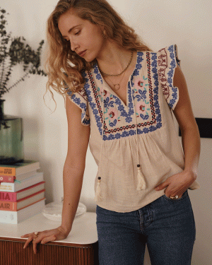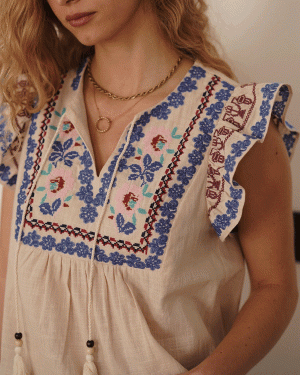 Blusa con detalle bordados estilo étnico con pequeño tirante voleado.