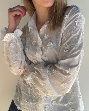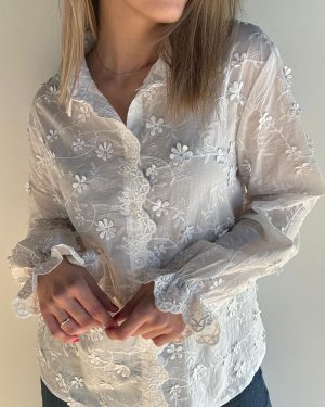 Camisa de manga larga con cuello camisero con flores en relieve y ribete ondeado en la zona de los botones.