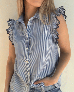Camisa de rayas sin mangas y con cuello camisero. Pequeño volante con calado en los tirantes.