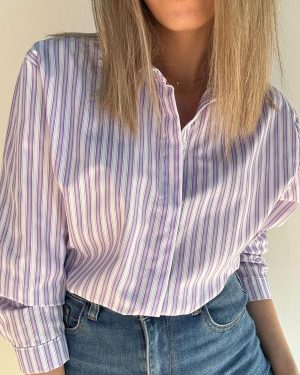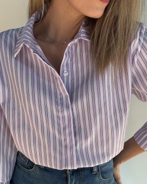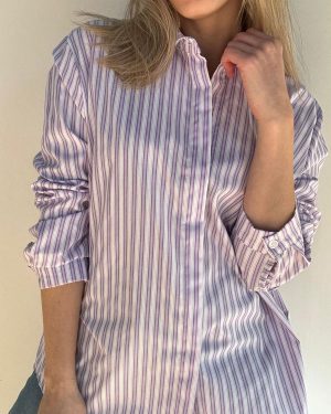 Camisa de rayas y manga larga con cuello camisero. La parte trasera es un poco más larga que la parte delantera.