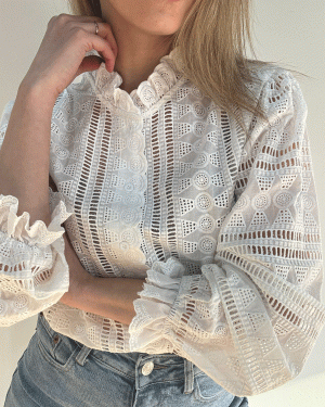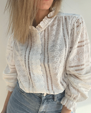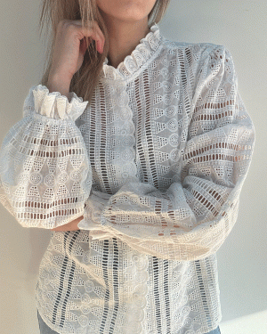 Camisa troquelada de manga larga con cuello maho rizado con puños frunciditos.