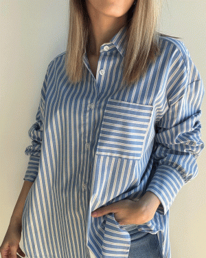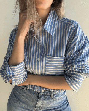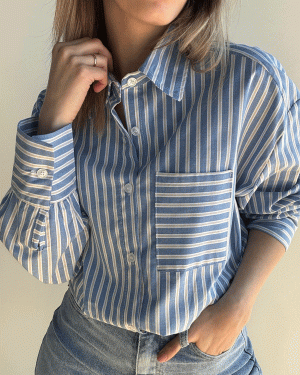 Camisa de rayas con solapa y manga larga y detalle de bolsillo delantero.