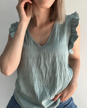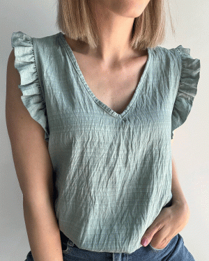 Blusa lisa sin mangas con cuello en forma de pico y pequeño volante en el tirante. Talla única.