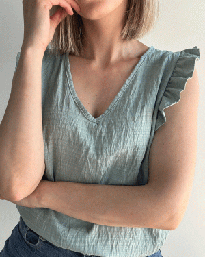 Blusa lisa sin mangas con cuello en forma de pico y pequeño volante en el tirante.