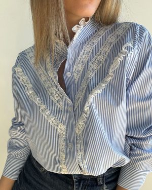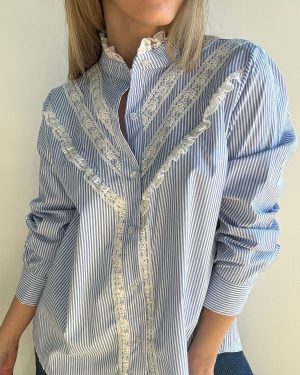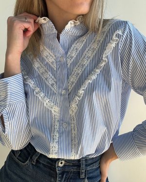 Camisa de manga larga y rayas con cuello perkisn rizado y combinado con ribete de puntilla. En la parte delantera tiene detalles en forma de uve con ribete de puntilla en color blanco. Talla única.
