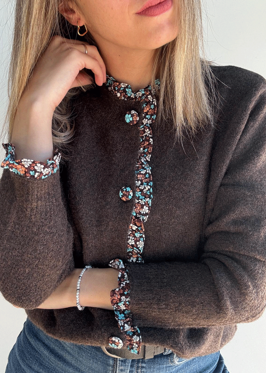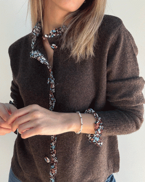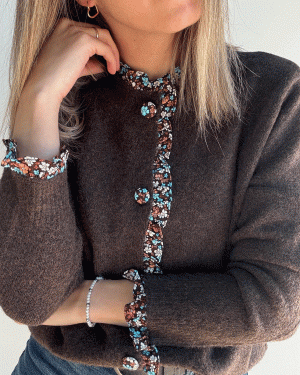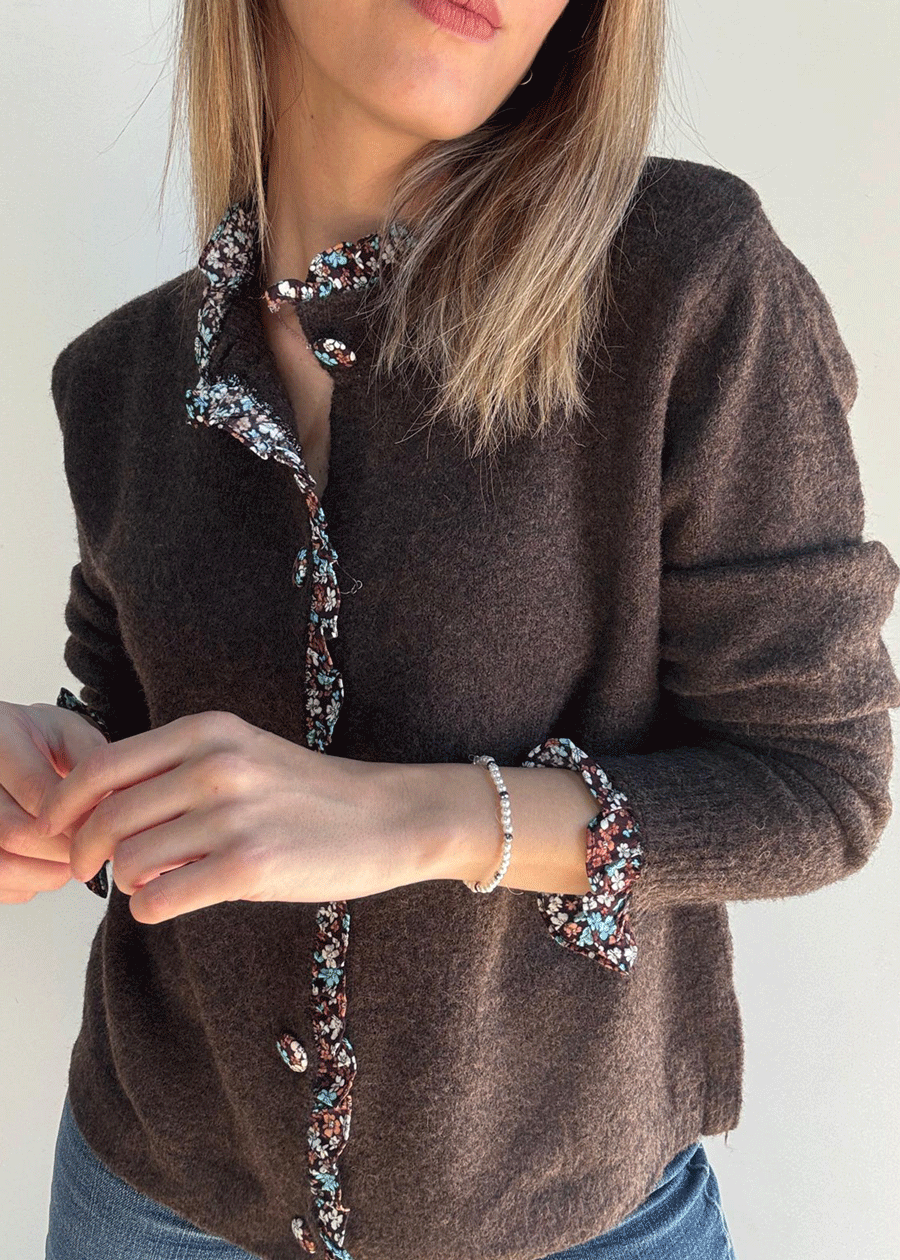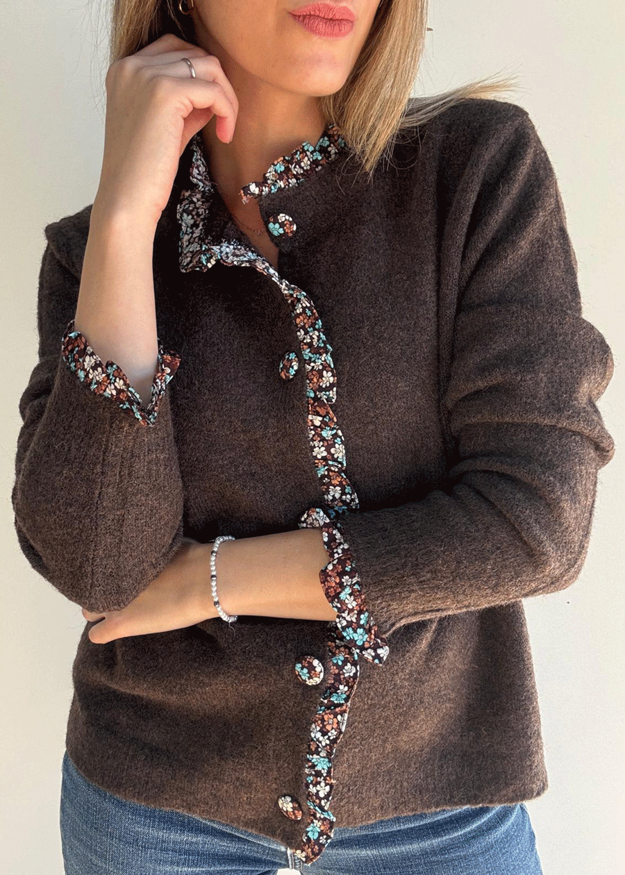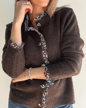 Cárdigan de manga larga con cuello perkins con detalle en estampado de flores tanto en botones como en ribete decorativo.