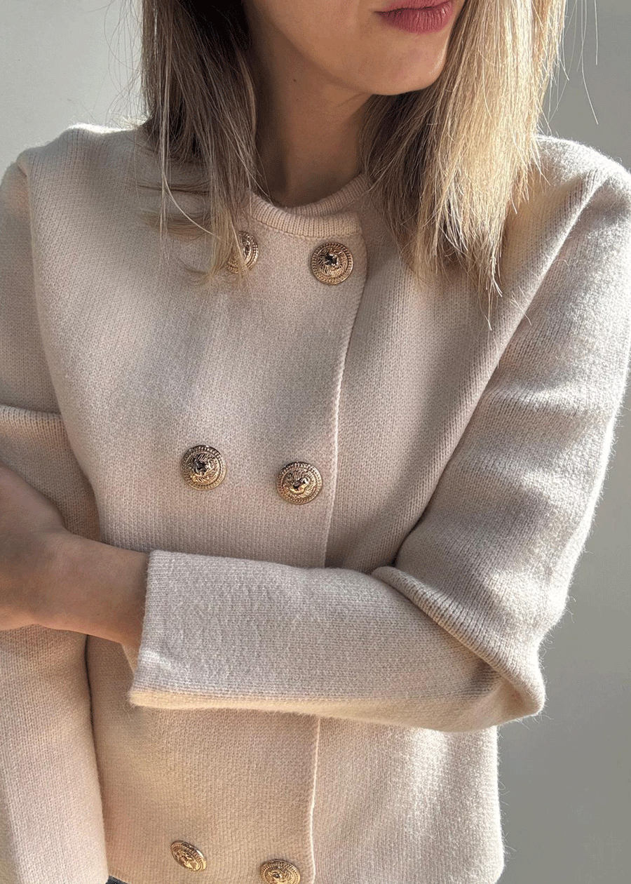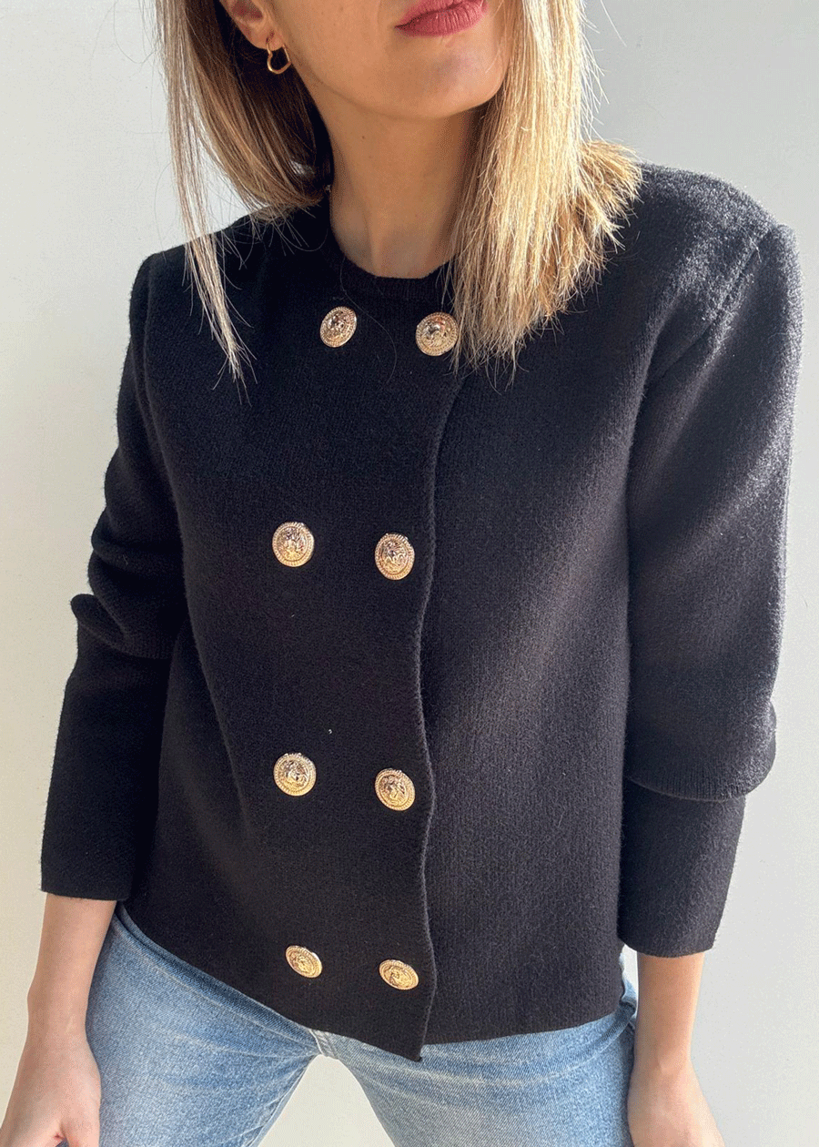 Cárdigan de cuello redondo y manga larga con botones de corchetes dorados en la parte delantera.