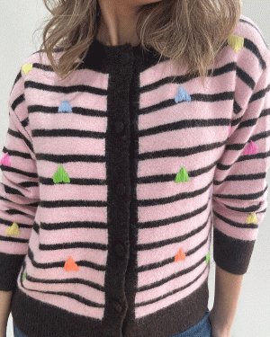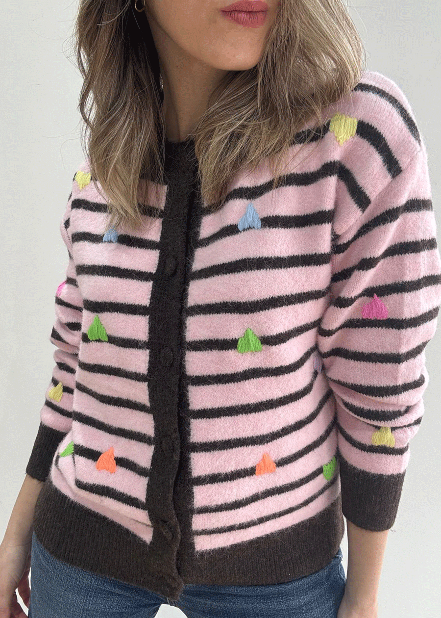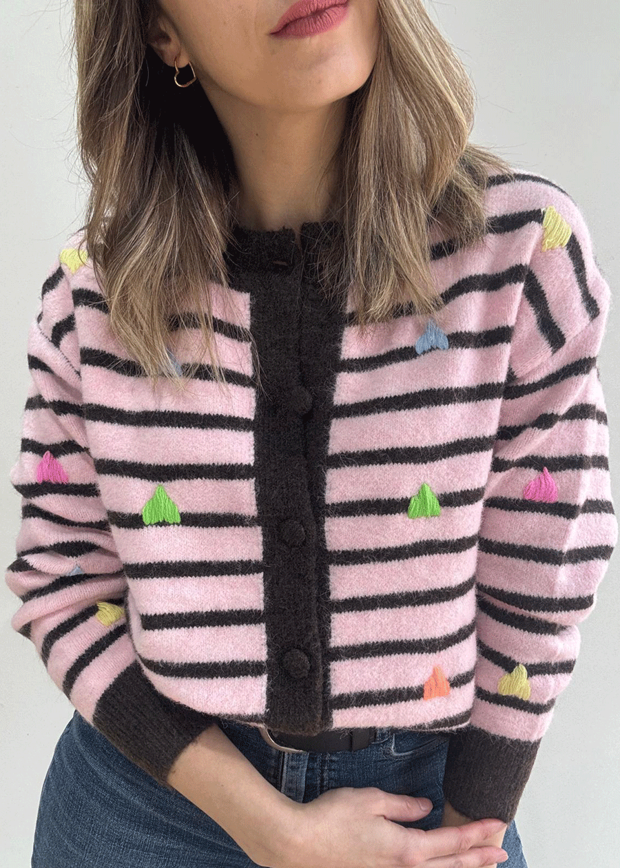 Cárdigan de manga larga con cuello redondo con rayas y corazones bordaditos en distintos colores.