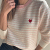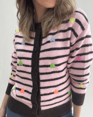 Cárdigan de manga larga con cuello redondo con rayas y corazones bordaditos en distintos colores. Talla única.