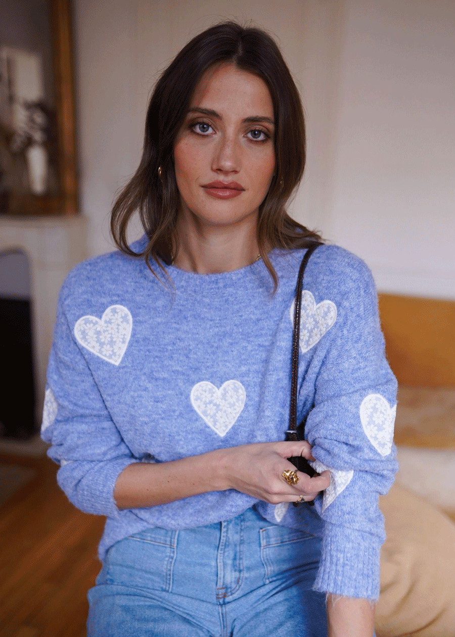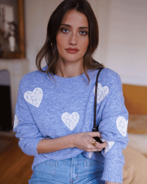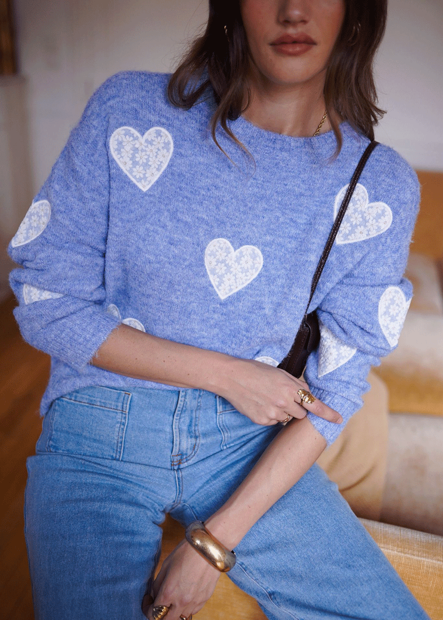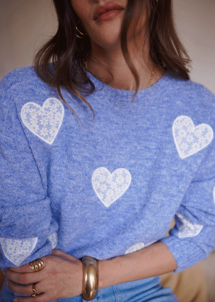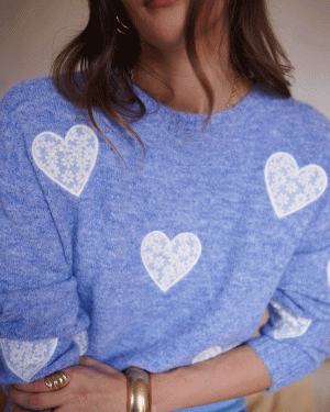 Suéter de manga larga con cuello redondo con corazones. Los corazones son en tejido troquelado de margaritas con un toque de brillo. Talla única.