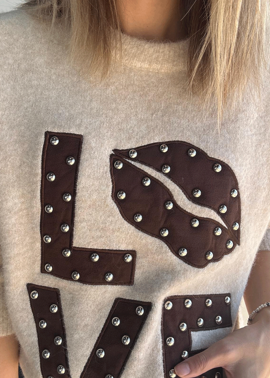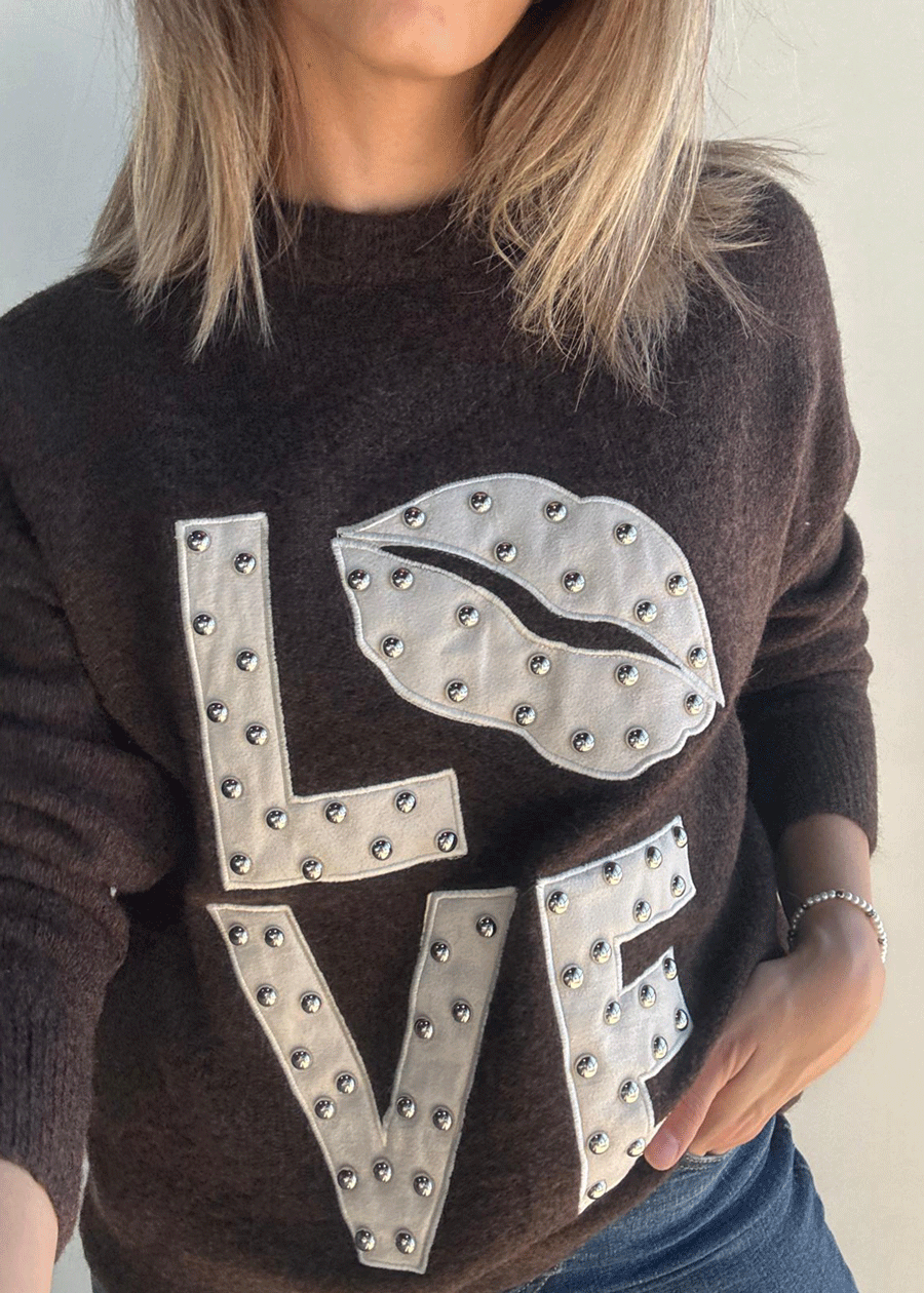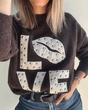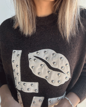 Suéter de manga larga y cuello redondo con detalles en polipiel y tachuelas en la parte delantera. Talla única.