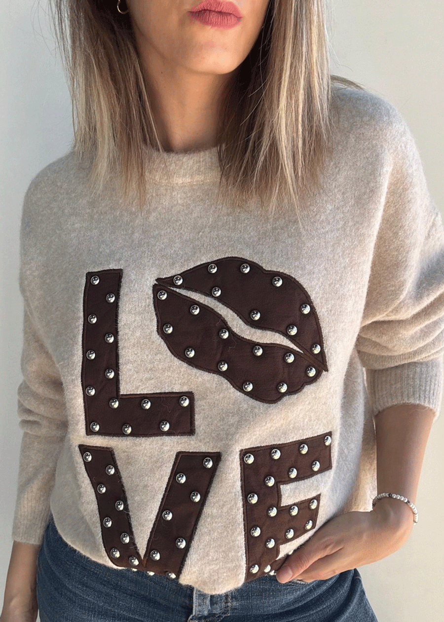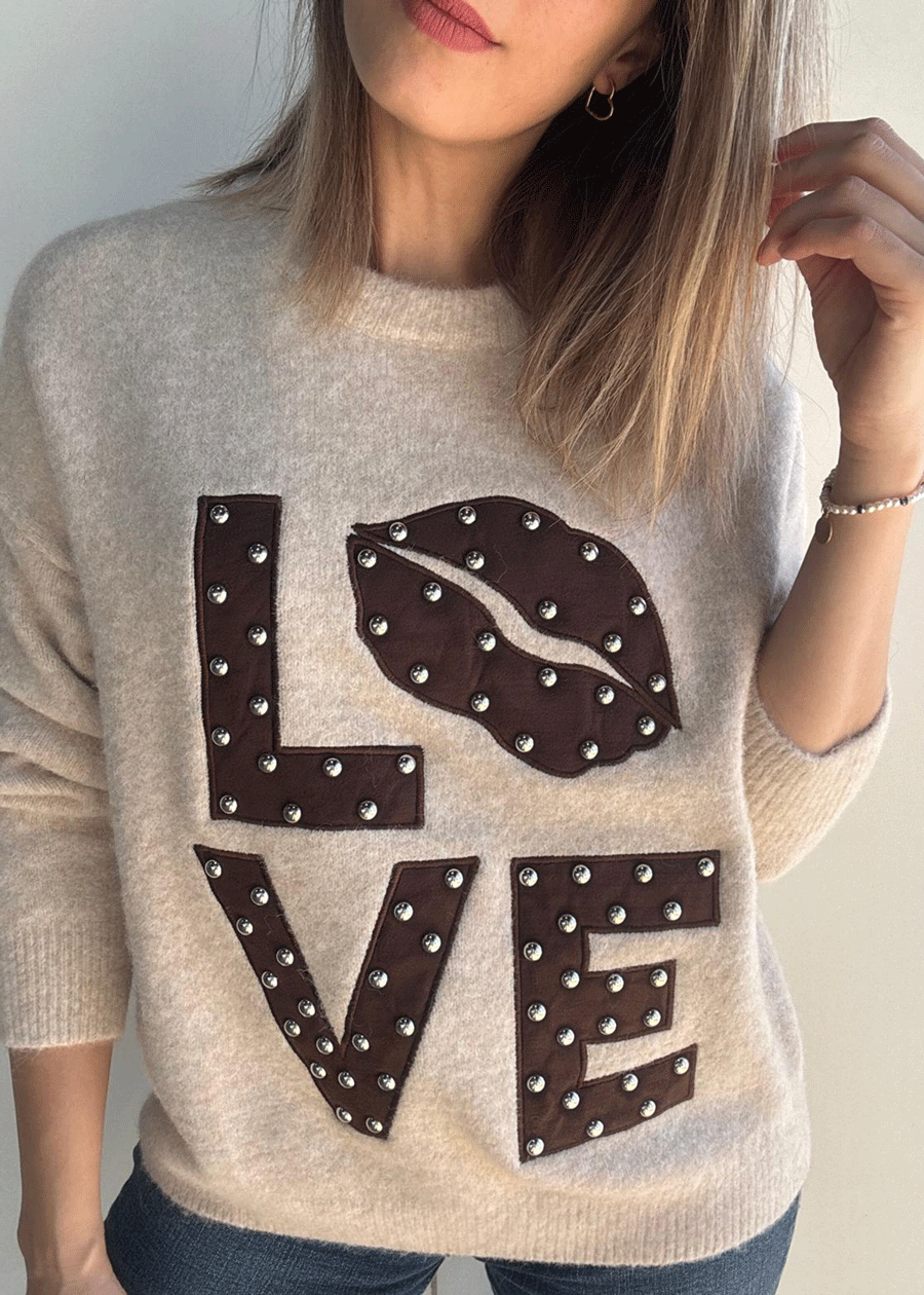 Suéter de manga larga y cuello redondo con detalles en polipiel y tachuelas en la parte delantera.