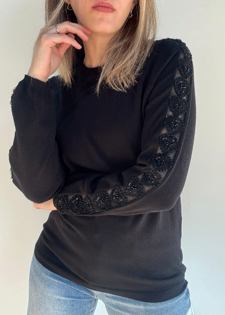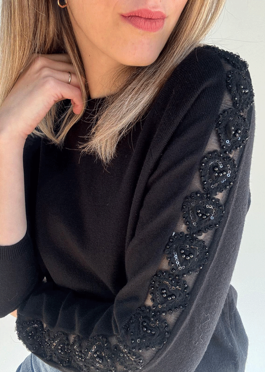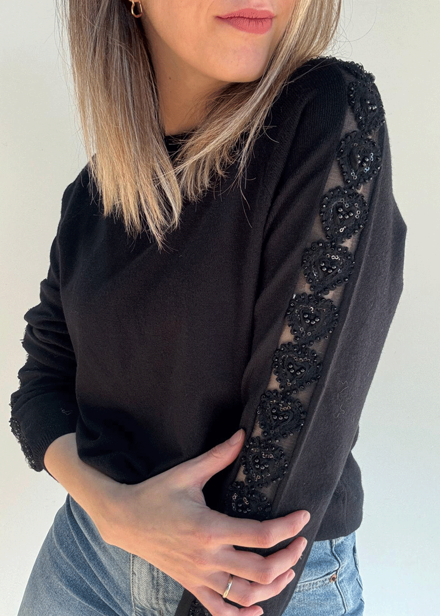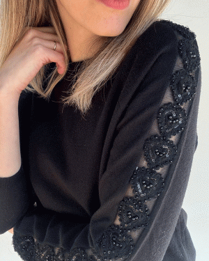 Suéter de manga larga con cuello redondo con detalle caladitos en la manga y con forma de corazones.