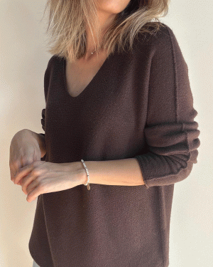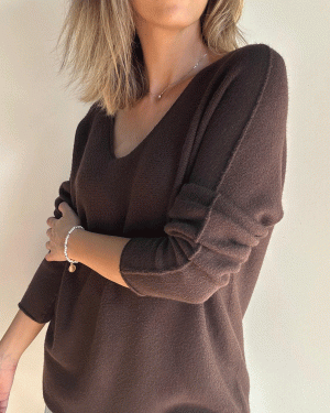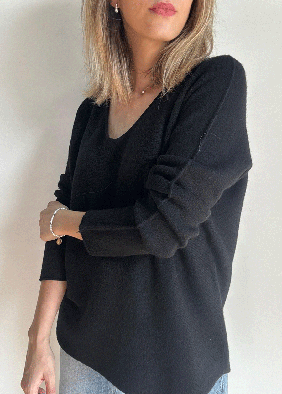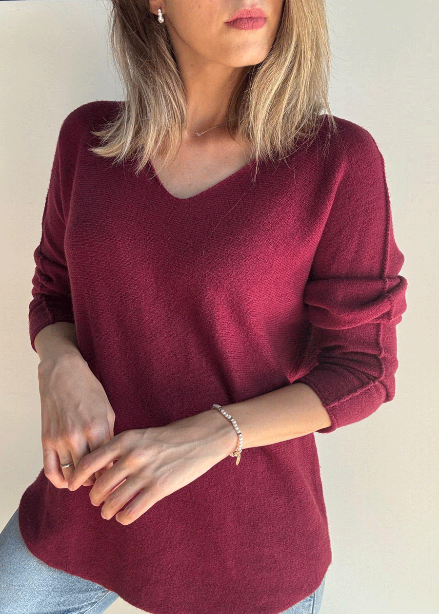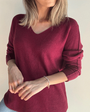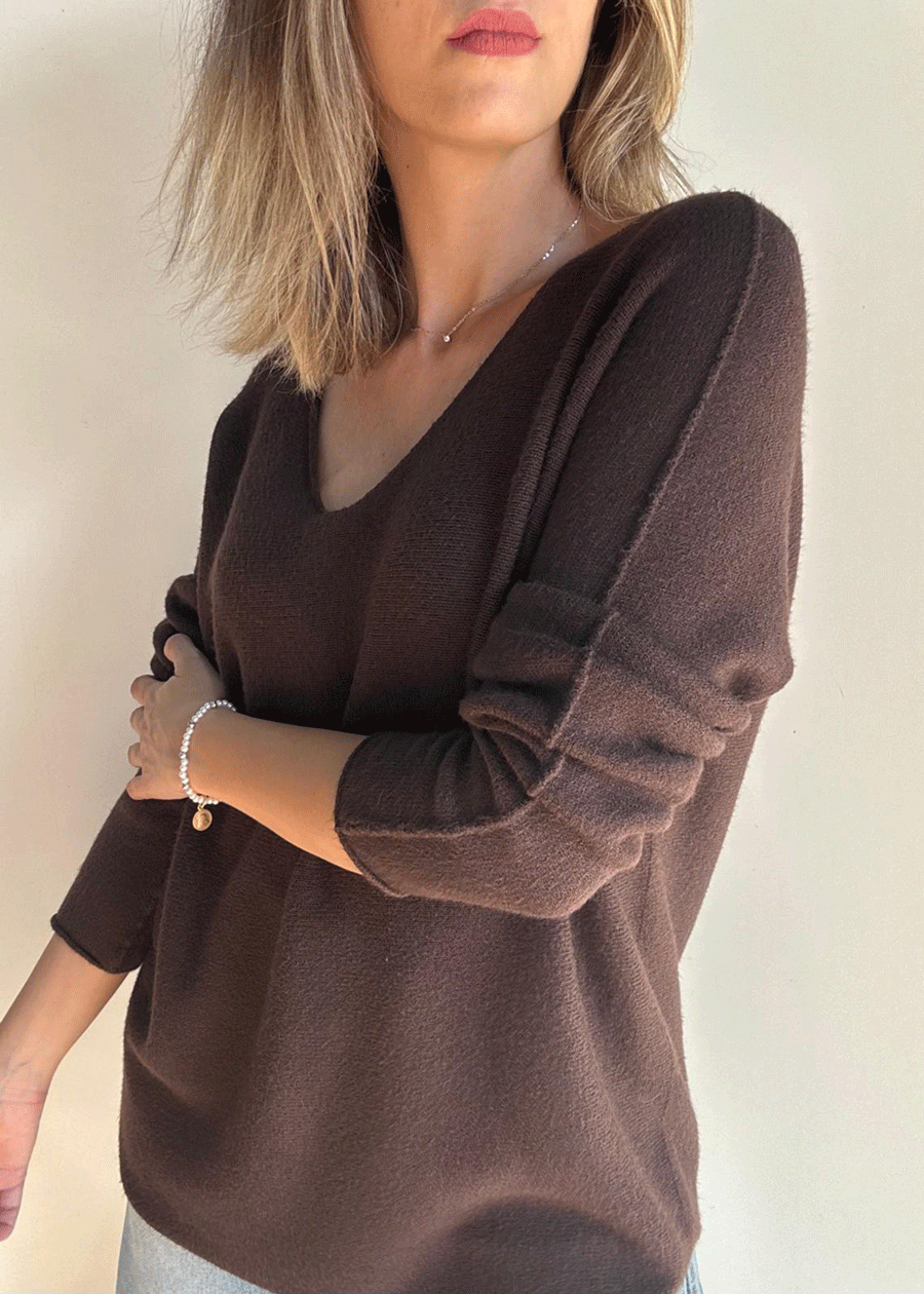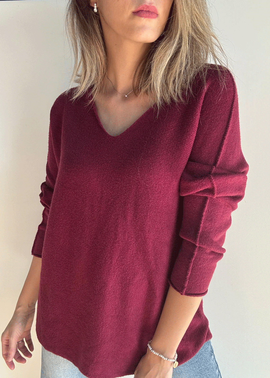 Suéter de manga larga con cuello pico y ribete en la manga. Talla única.