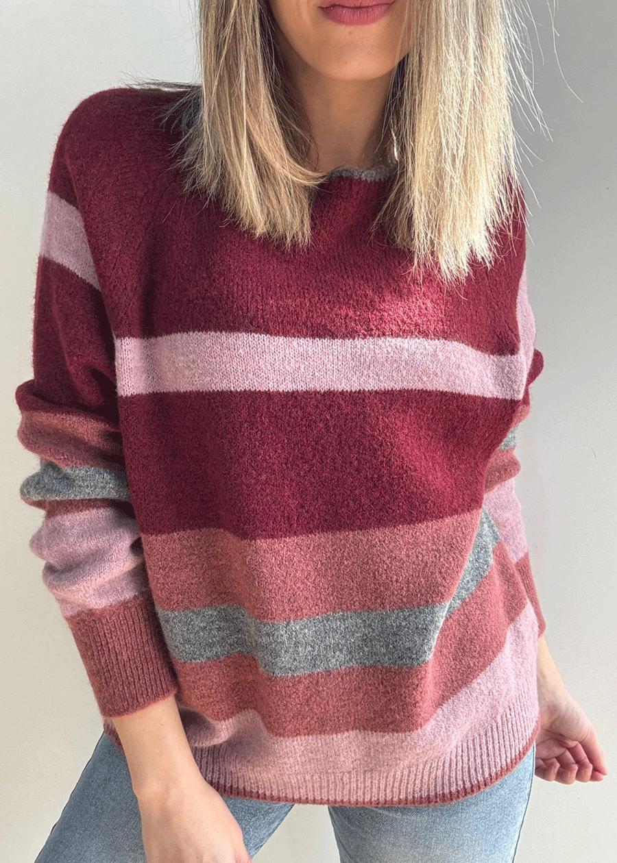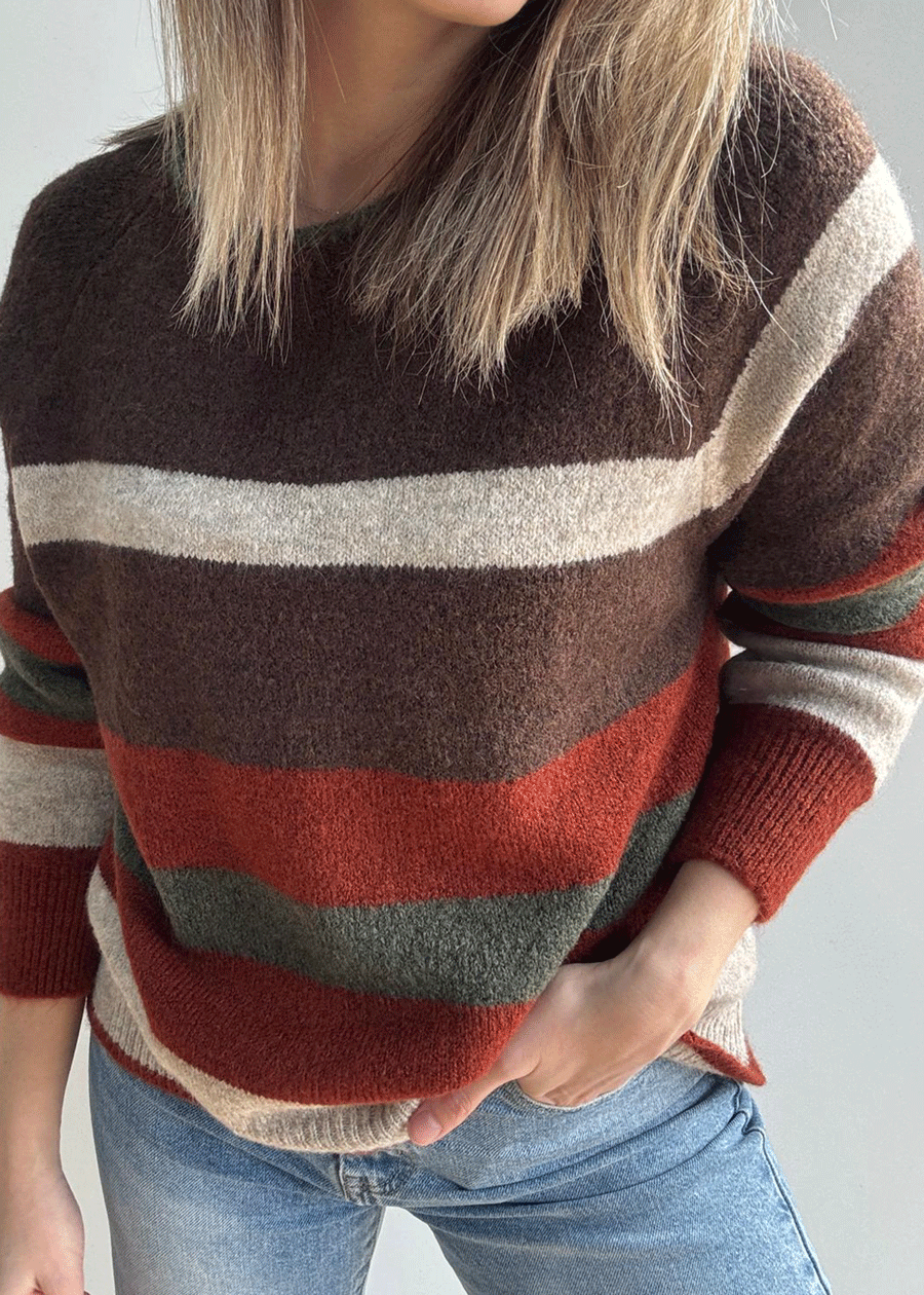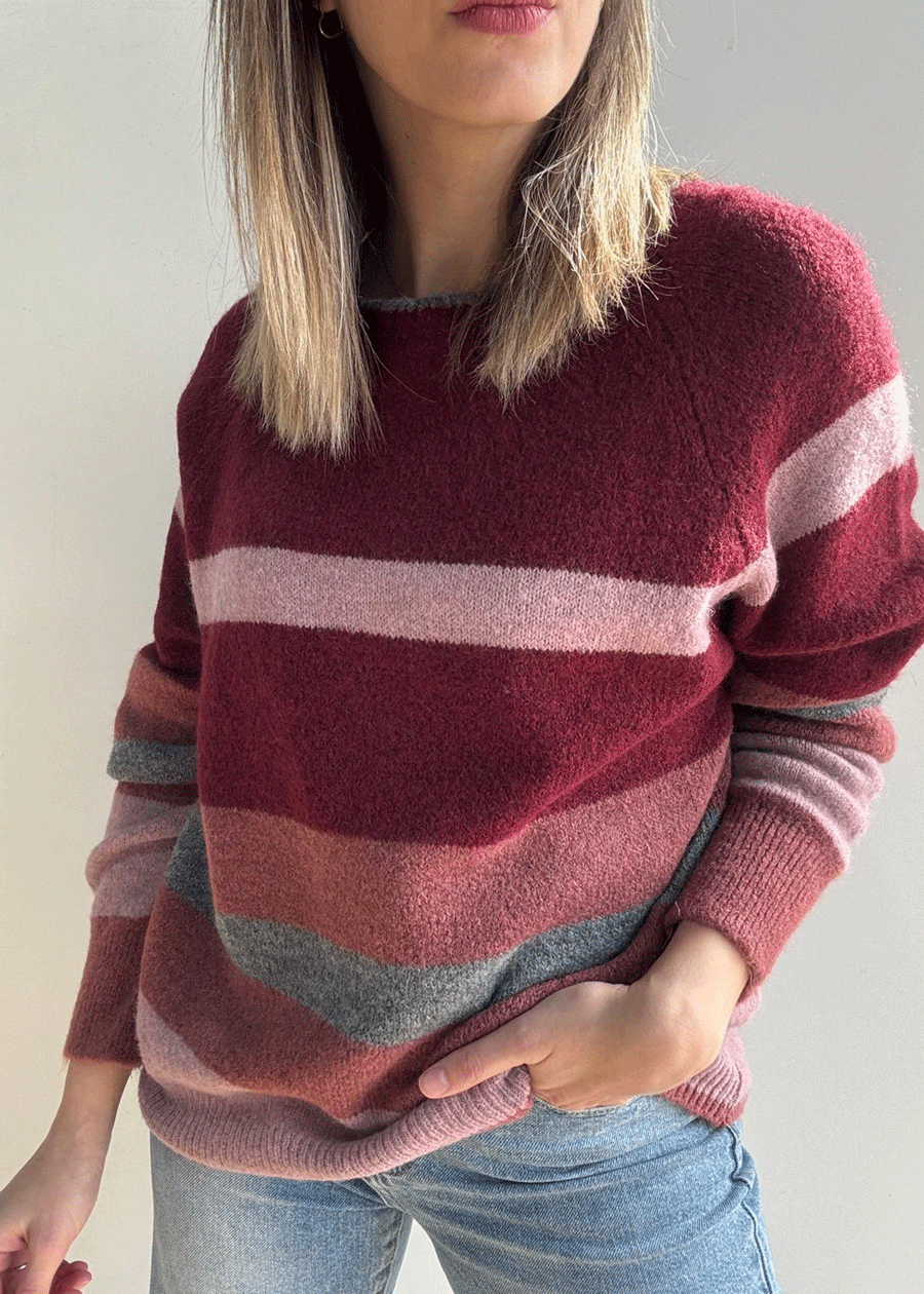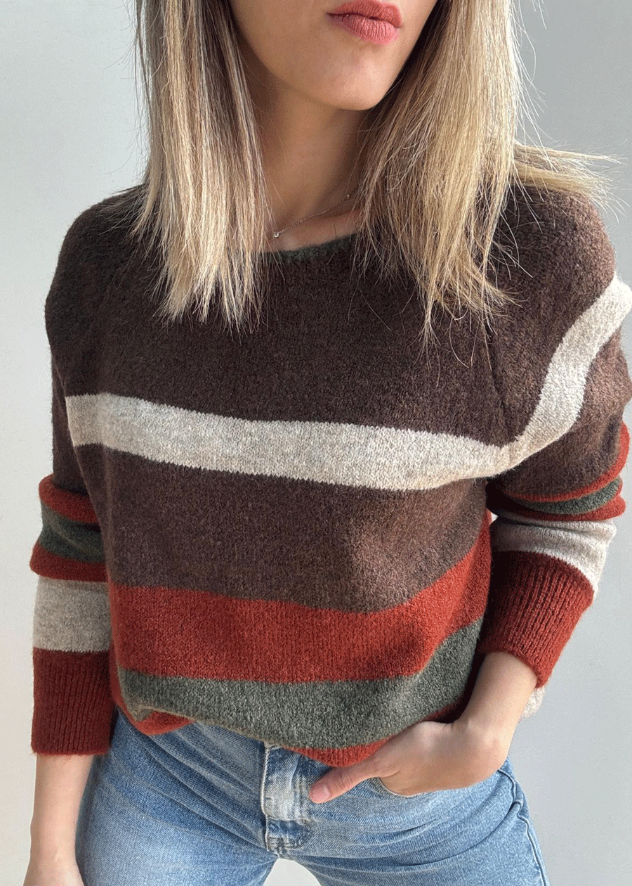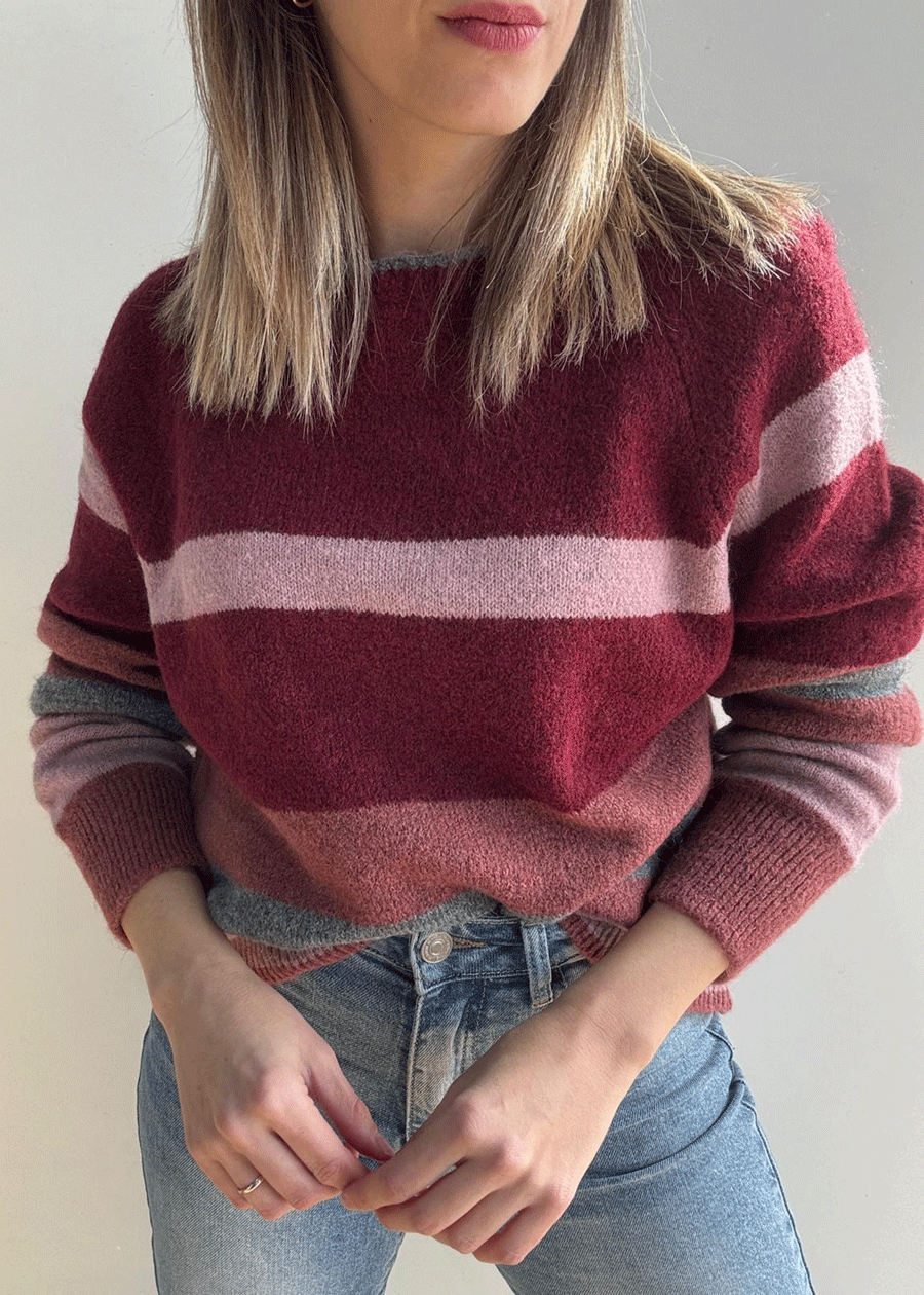 Suéter de cuello redondo y manga larga combinado en diferentes franjas de colores.