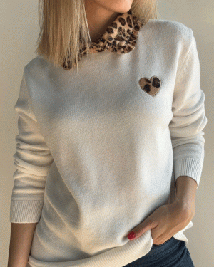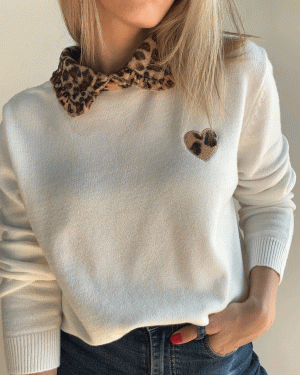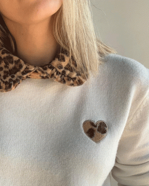 Jersey de cuello bebe con corazón bordado en la parte delantera. Tanto el cuello como el corazón son de animal print.