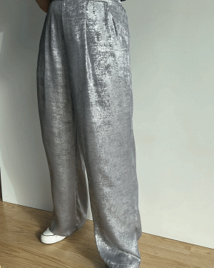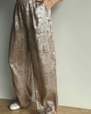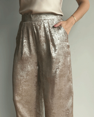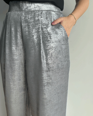 Pantalón fluido recto metalizado con elástico en la parte de atrás de la cintura y dos bolsillos delanteros. Composición: 100% Poliéster.