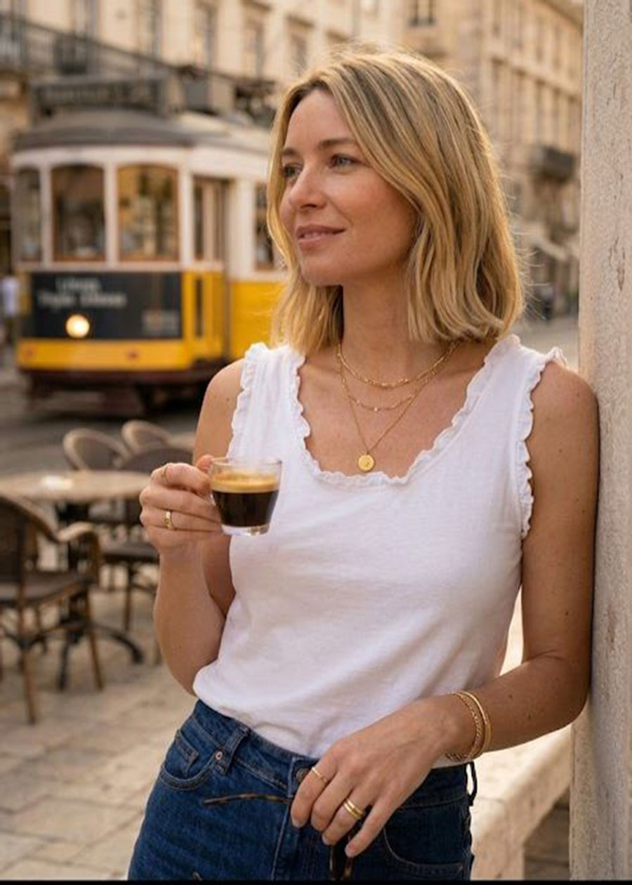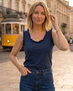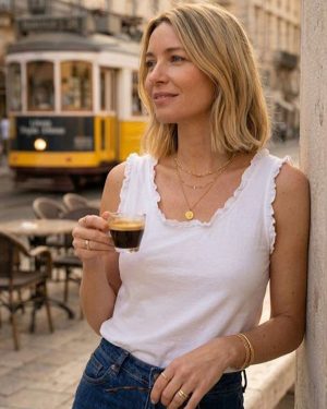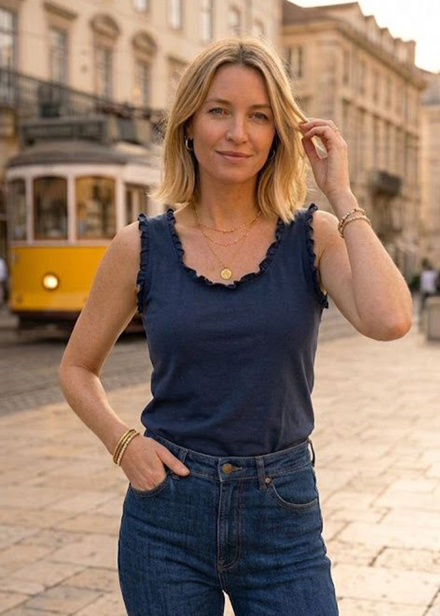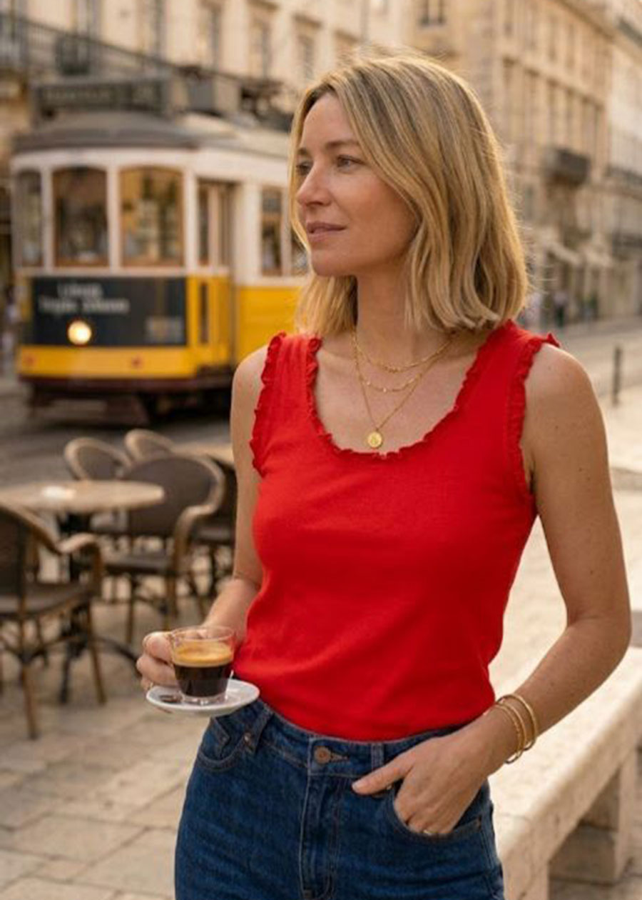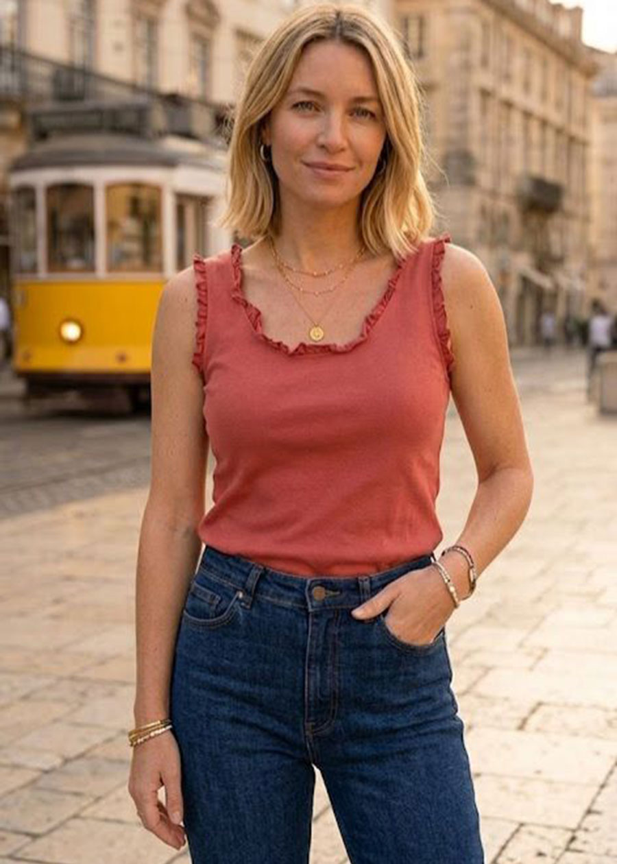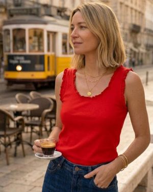 Top de tirante con cuello redondo y ribete fruncidito. Talla única.