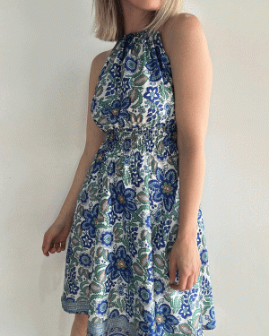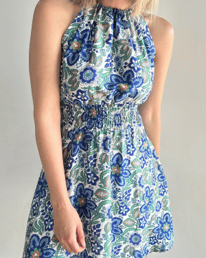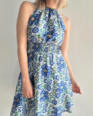 Vestido estampado con cuello halter y detalle en nido de abeja.