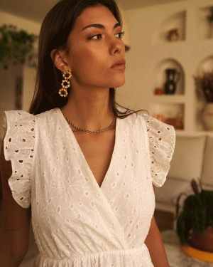 Vestido corto sin mangas con pequeños troquelados y cordón en la espalda, tiene forro interior para evitar posibles transparencias.