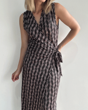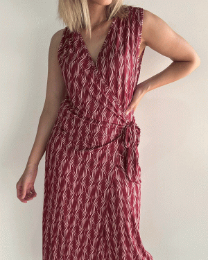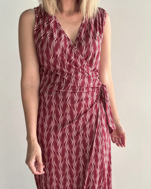 Vestido largo estampado cruzado con nudo lateral. El tejido es de licra fría, no se arruga y tiene mucha caída.