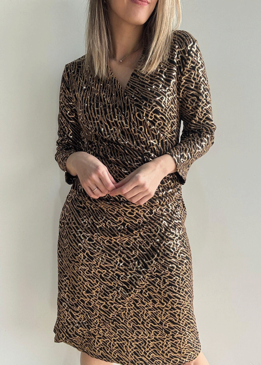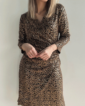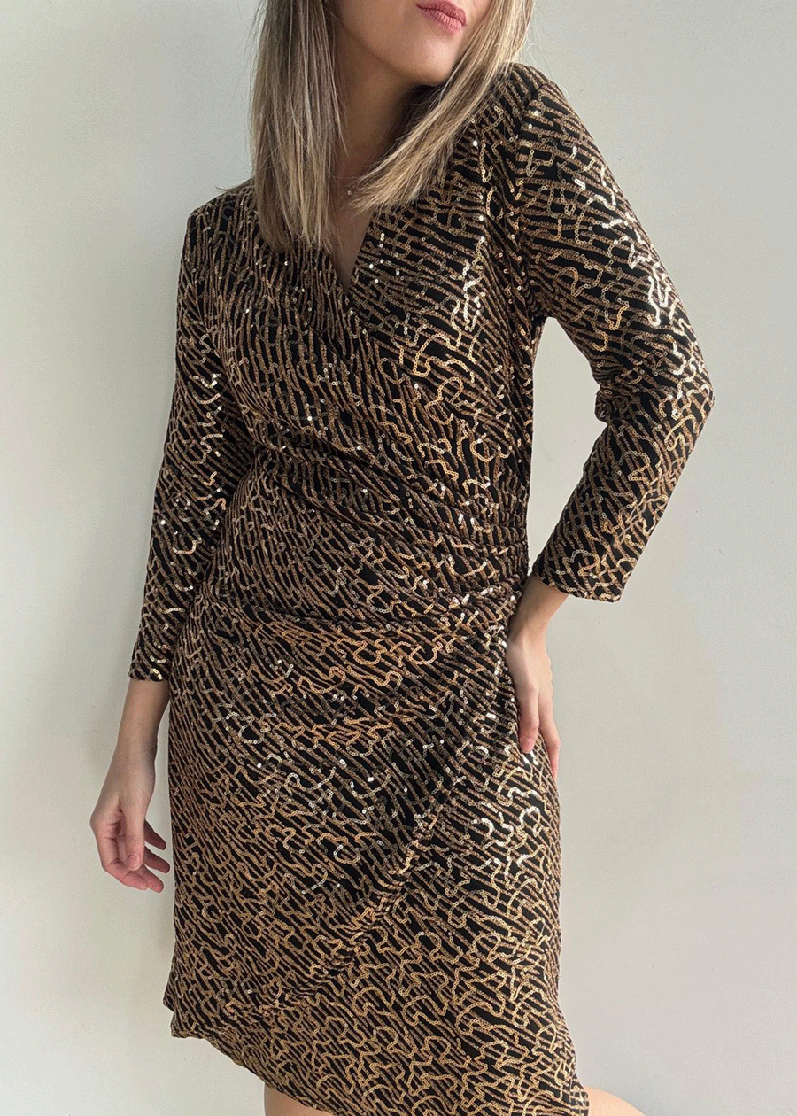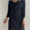 Vestido cruzado de manga larga con drapeado en el largo y escote pico cruzado.